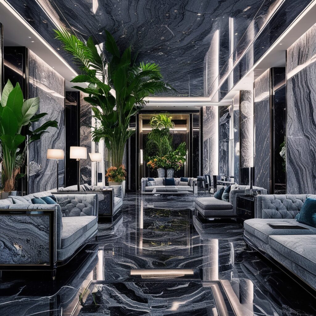 Markino Granite is a sophisticated natural stone featuring a dark base with intricate white and black veins, delivering a dramatic and high-contrast look. Its timeless appeal makes it ideal for elegant interiors.