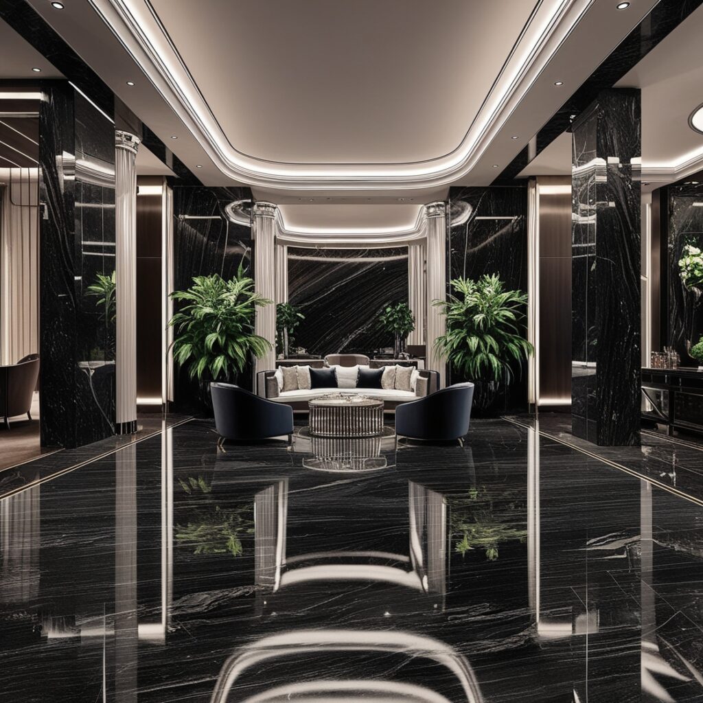 River Black Granite features a black background interspersed with flowing white and grey veins, resembling the movement of a river. Its bold design is perfect for artistic interiors.